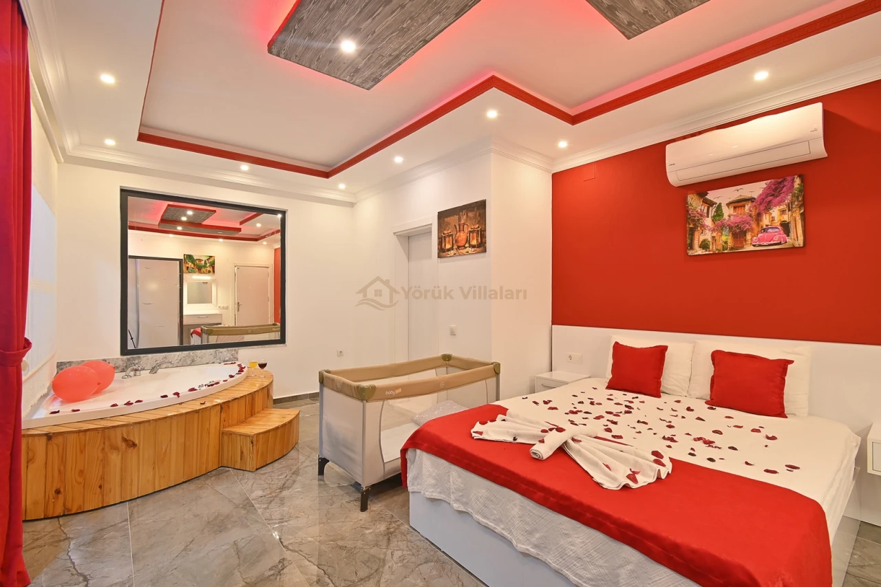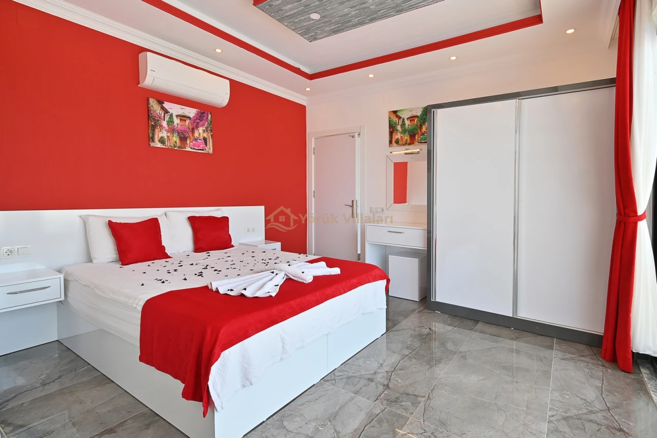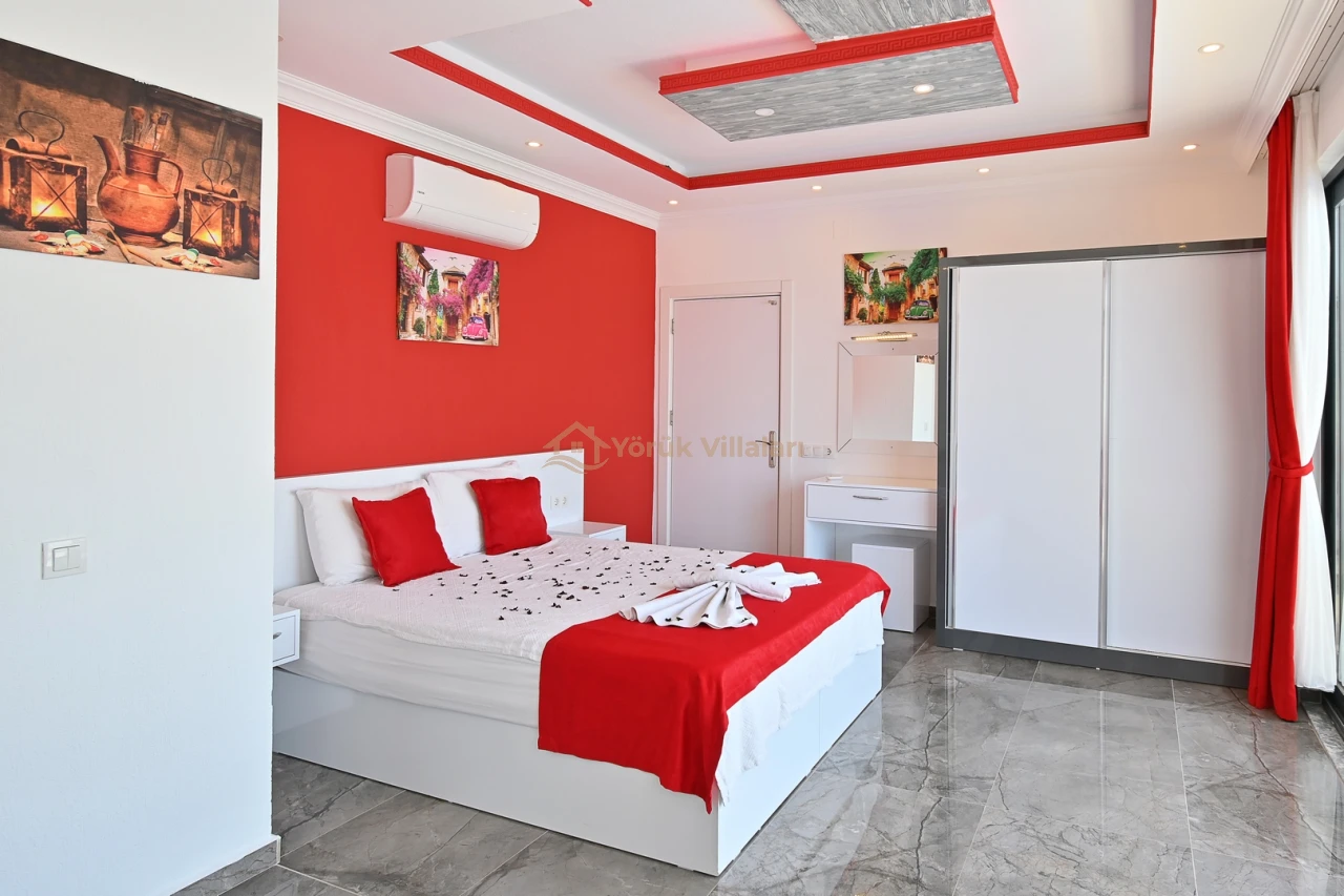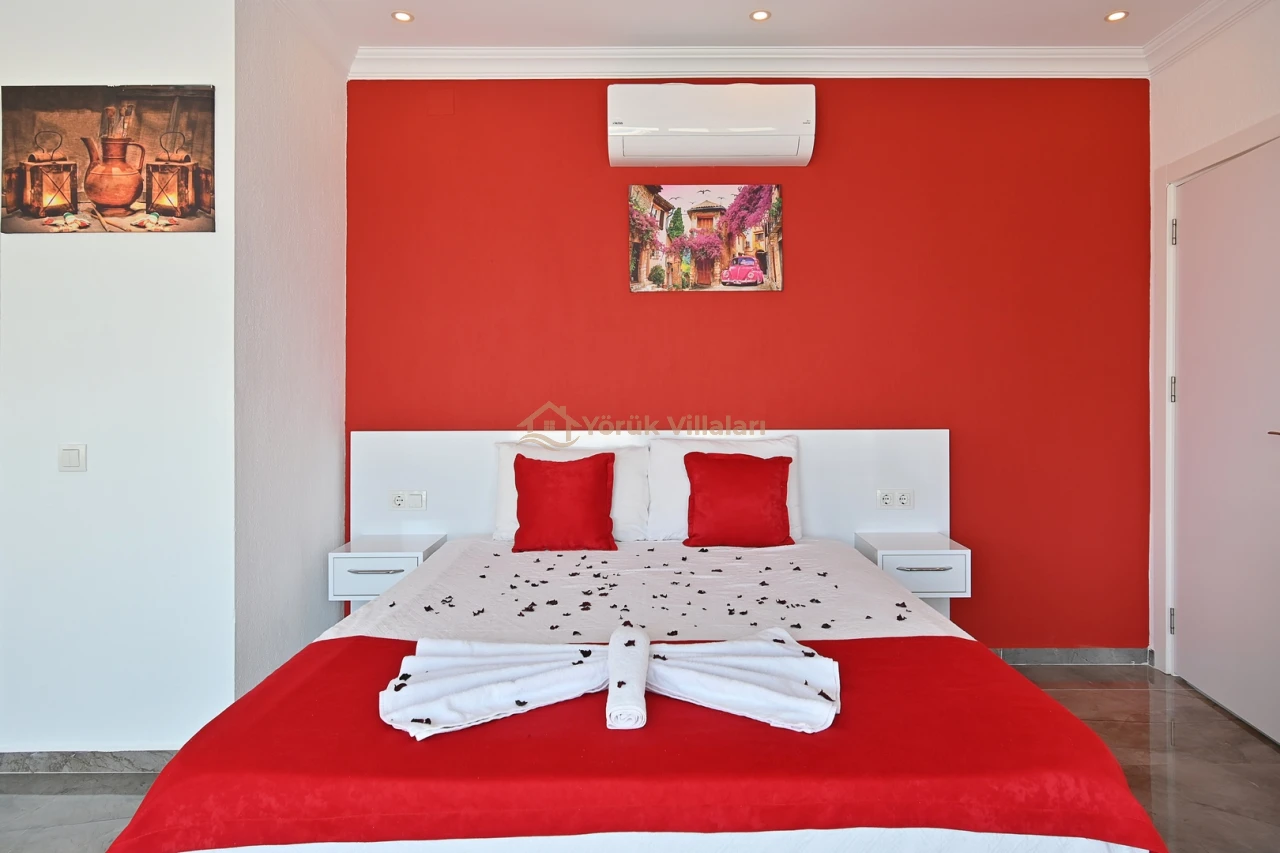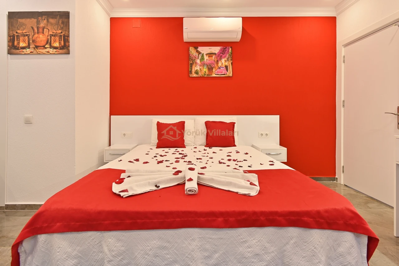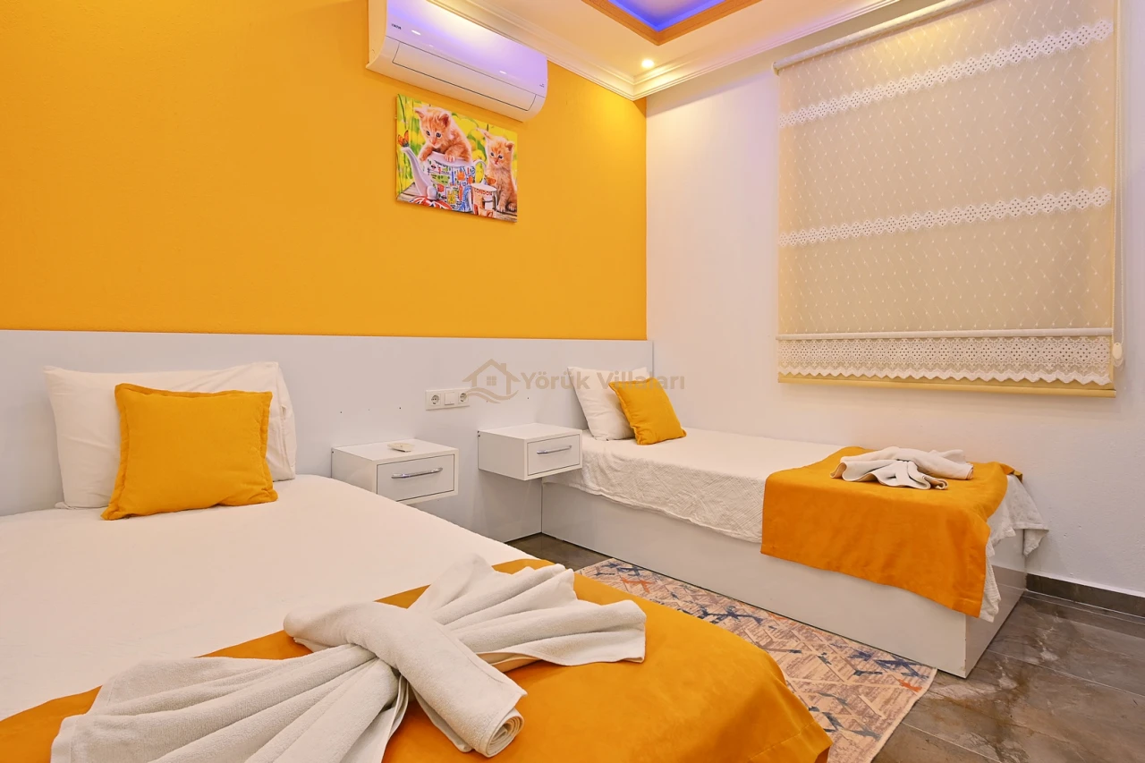 Villanın iç mekanında iki yatak odası ve iki banyo mevcuttur. Bir adet çift kişilik yatak ve iki adet tek kişilik yatak ile misafirlerine rahat bir uyku ortamı sunar. Bebek yatağı da düşünülen detaylar arasında yer almaktadır.